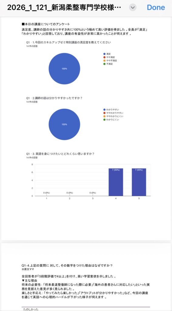 今回の、新潟柔整専門学校の生徒さんたちもこれをきっかけに少しでも英語に対するハードルを下げ、英語学習を続けてもらい、将来的には英語を使えるセラピストになってもらいたいです!